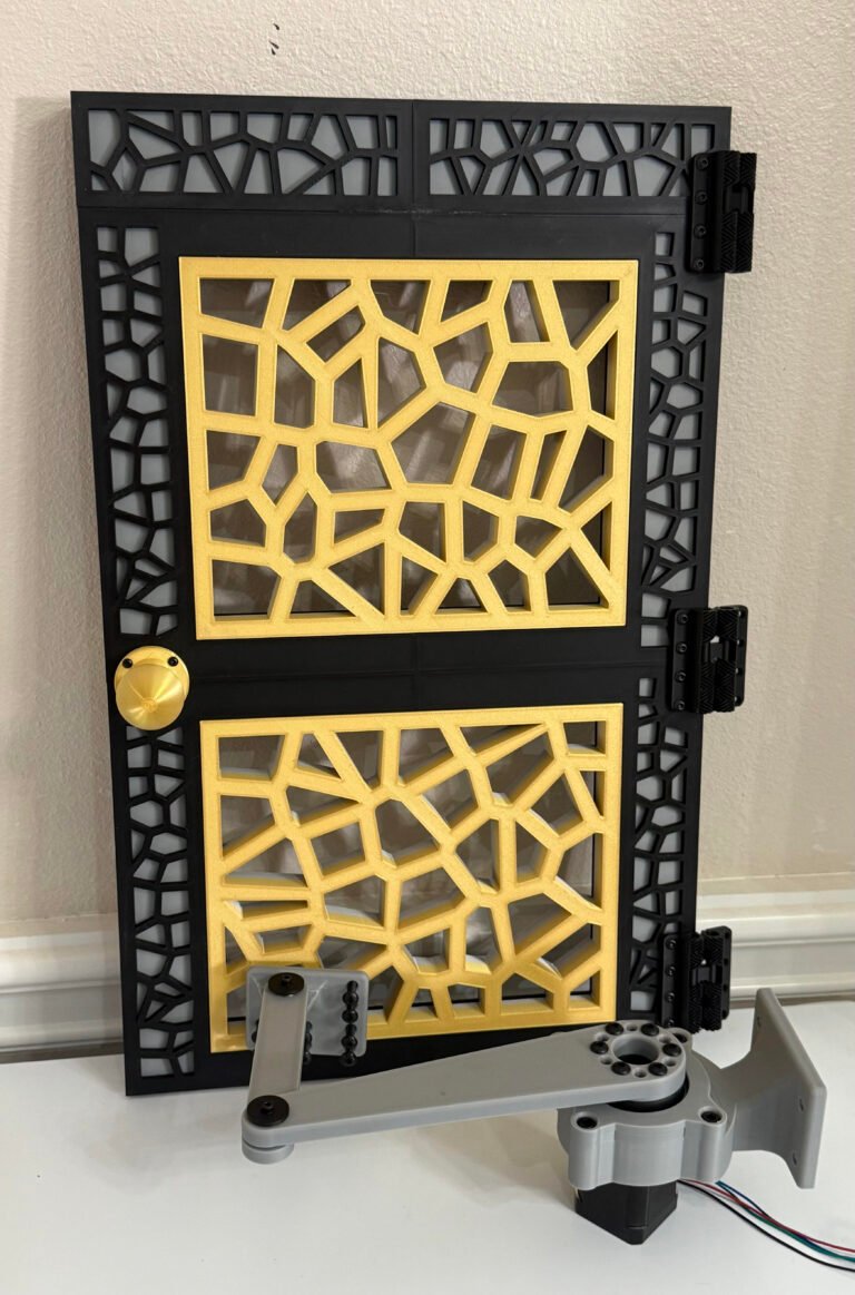After spending some time in CAD on various designs, I kept daydreaming about a swinging door – a fancy one with a “stained glass” vibe and color scheme to match the coop. Our opening for the hens is approximately 24″ tall and 13.5″ wide – meaning a door to fit this opening would take at least 6 prints on the X1Carbon with a 10″ print bed width. Breaking it into multiple pieces, ensuring it is sturdy and level, and making it look good is going to be a challenge. Using the veronoi pattern tool, we were able to come up with a pretty slick design for our “screens” and we will use mounting holes to help bind each of the two sides for the top and bottom. Stainless steel dowel rods and 4mm hex bolts hold the (8) frame pieces in place to allow for an extremely sturdy multi-piece print.